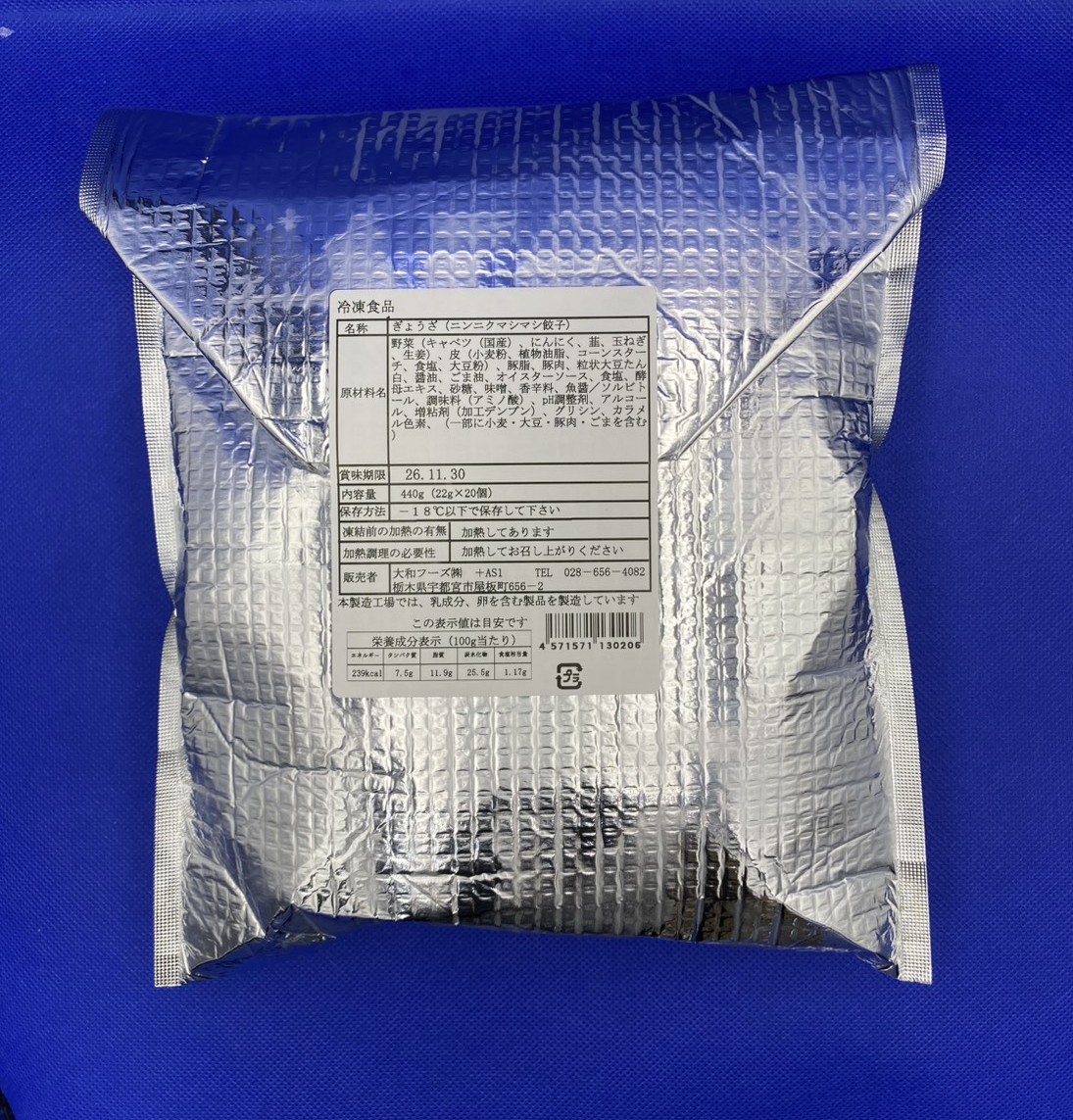 野菜(キャベツ(国産)、にんにく、葱、玉ねぎ、生姜)、皮(小麦粉、食物油脂、コーンスターチ、食塩、大豆粉)豚脂、豚肉、粒状大豆たん白、醤油、ごま油、オイスターソース、食塩、酵母エキス、砂糖、味噌、香辛料、魚醤/ソルビトール、調味料(アミノ酸)、pH調整剤、アルコール、グリシン、増粘剤、(加工デンプン)、カラメル色素、(一部に小麦、大豆、豚肉、ごまを含む)